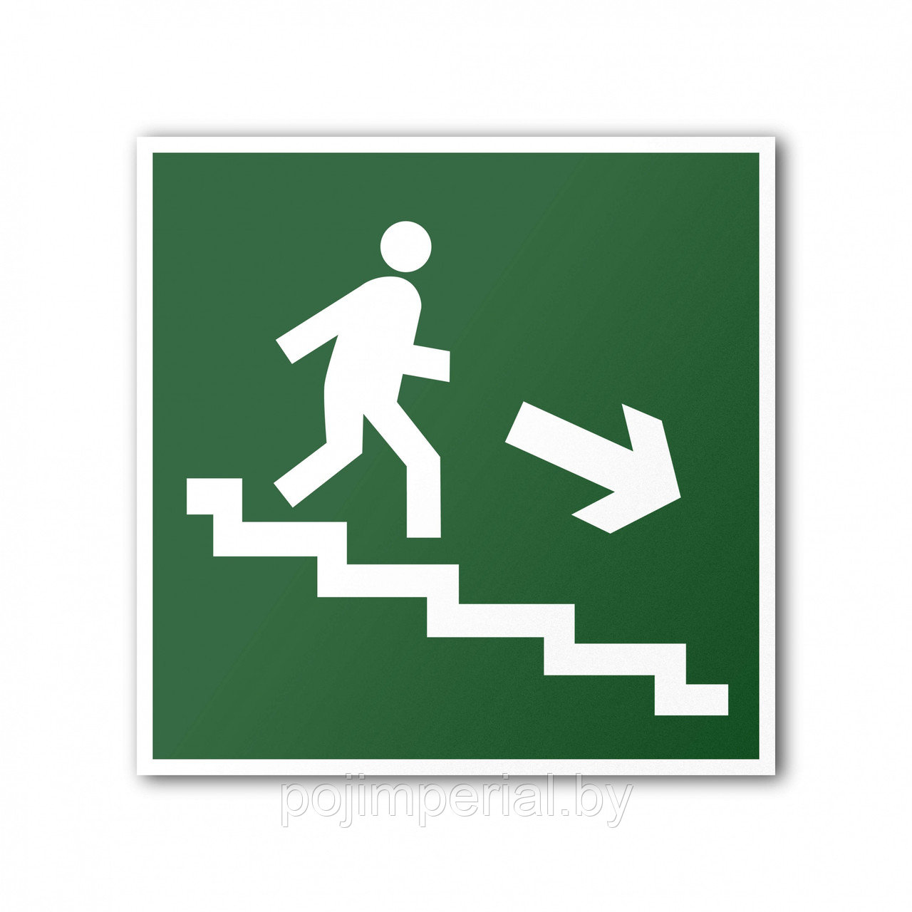 Знак Направление к эвакуационному выходу используется на путях эвакуации при движении по лестнице вниз.